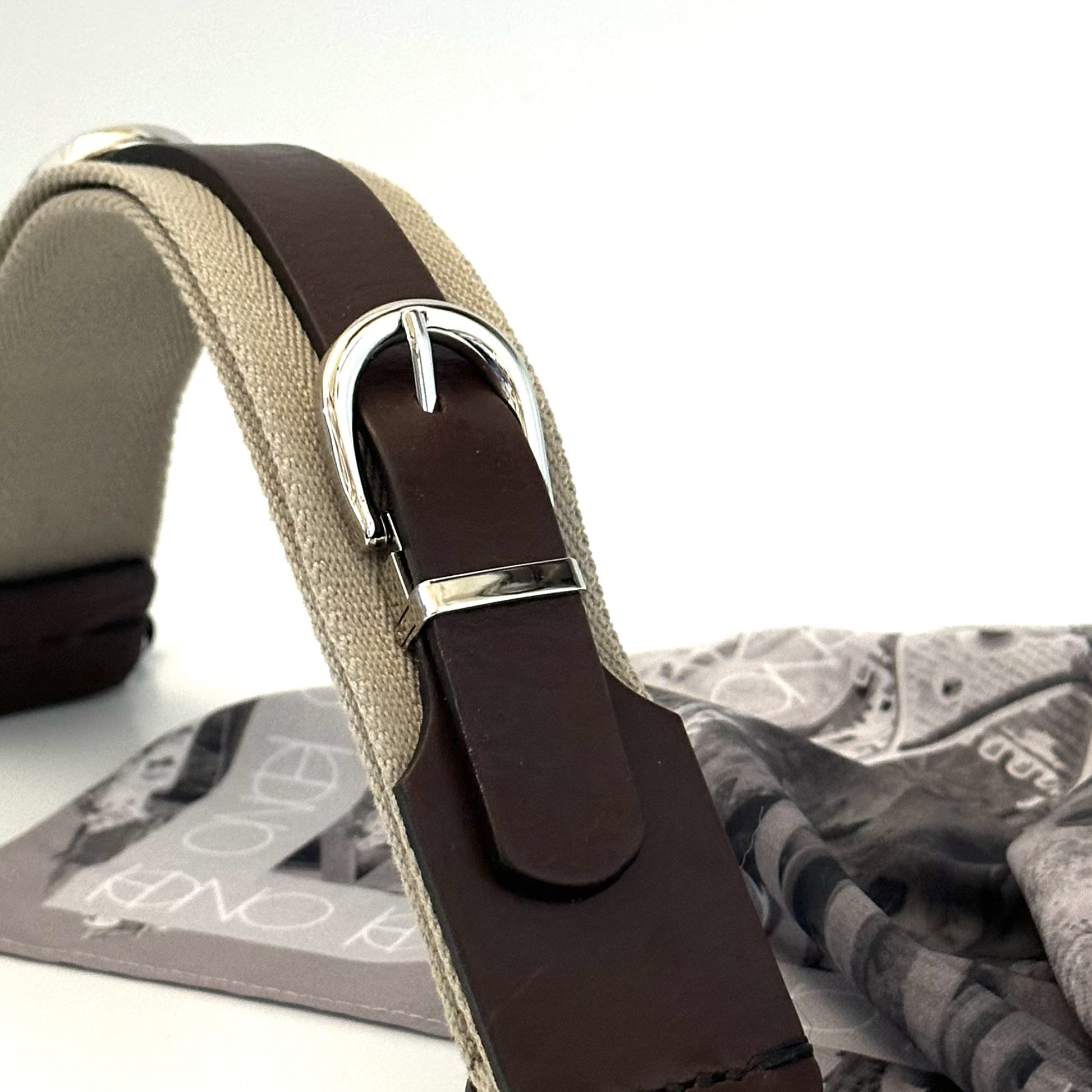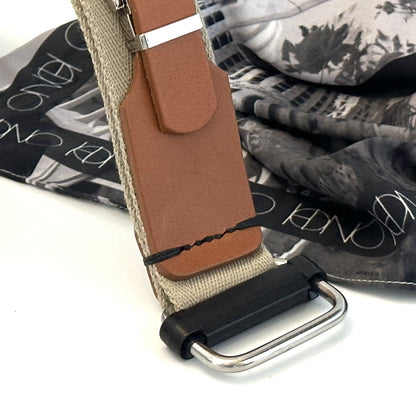 - Made with 100% recycled polyester tape or vegetable tanned leather